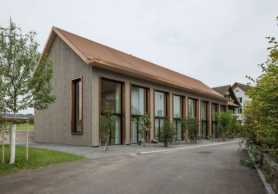 Der rund 730 Quadratmeter Bruttogrundfläche umfassende Neubau greift die Grundstrukturen der Nachbarn auf: Vor allem in der Gesamthöhe und der zurückhaltenden Farbgebung, aber auch in der Dreiteilung der Fassade in Sockel, Schaft und Dachgeschoss sowie im Rhythmus der Fenster, bei denen auf zwei schmale stets ein breiteres folgt. So unterscheiden sich die Gebäude zwar in ihren architektonischen Einzelheiten, bilden aber gleichzeitig eine klare, zusammenhängende Fassade für den öffentlichen Raum der Stadt.